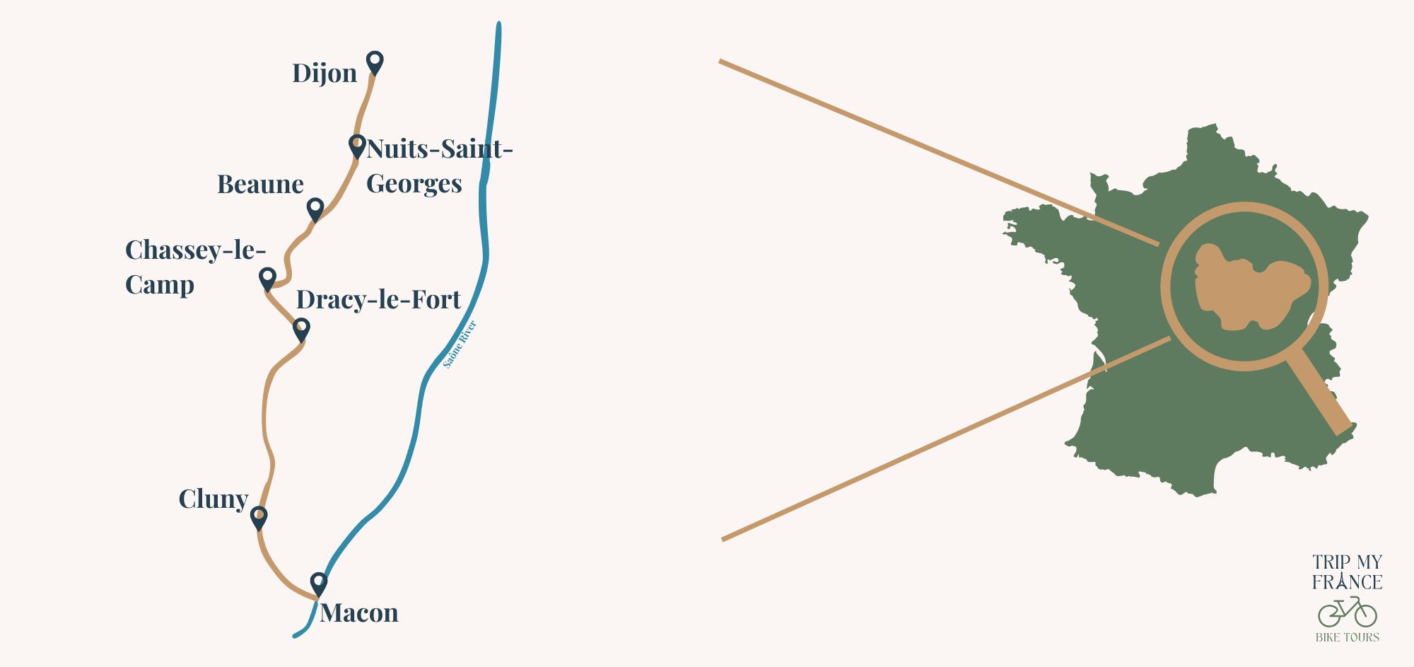 Discover the beauty of Burgundy by bike, one of France’s most celebrated wine regions, on a scenic cycling route from Dijon to Mâcon. This itinerary combines cycling pleasure, cultural heritage, and world-class wine tasting. Follow the legendary Route des Grands Crus, passing through prestigious appellations such as Gevrey-Chambertin, Nuits-Saint-Georges, Beaune, Meursault, Puligny-Montrachet, and Santenay.