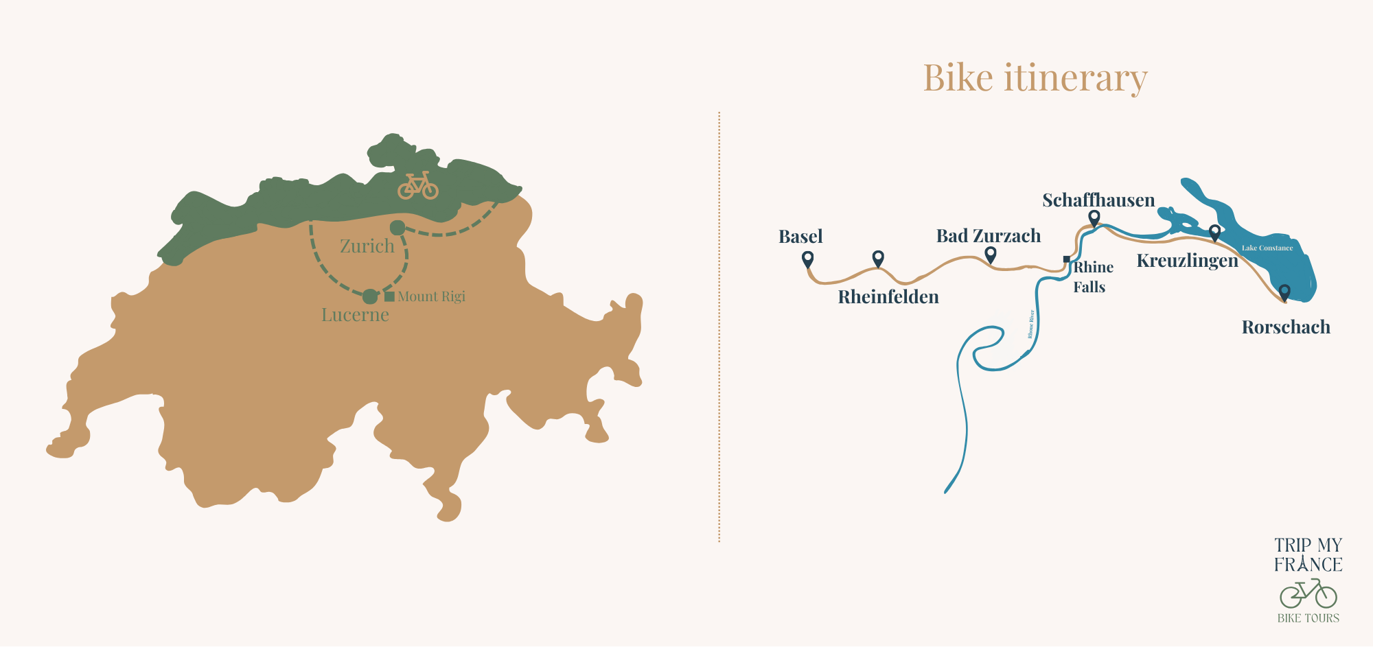 Along the way, you’ll ride on perfectly maintained bike paths that wind through orchards, vineyards, forests, and charming Swiss towns. The journey culminates with the discovery of Lucerne and the Alps, offering sweeping panoramas of lakes and peaks for a fully immersive experience of nature, heritage, and cycling pleasure.
