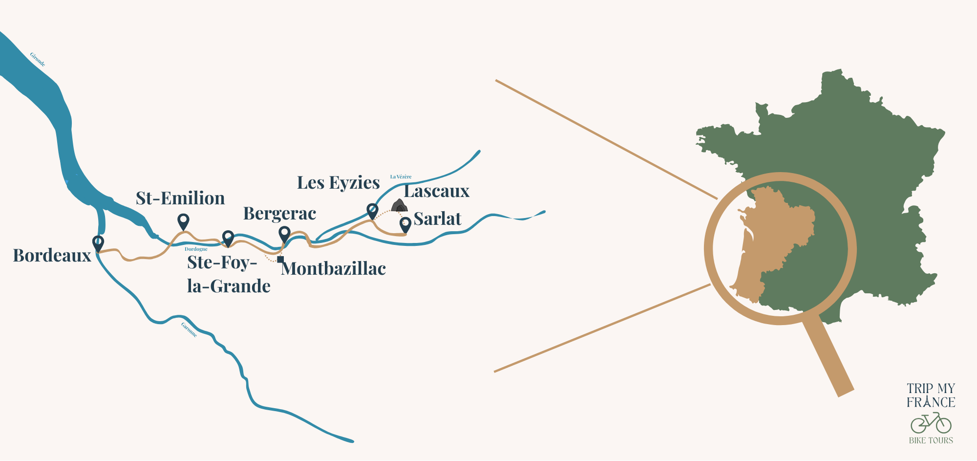This is a true immersion into the French art de vivre, where every stop invites you to taste the local products : Bordeaux wines, foie gras, truffles, walnuts and duck confit. All within a landscape where history and nature meet at every turn. Between the Garonne River and the cliffs of the Vézère Valley, this cycling journey from Bordeaux to Sarlat is more than just a route. It’s a human, sensory and cultural experience, to be savored one pedal stroke at a time.