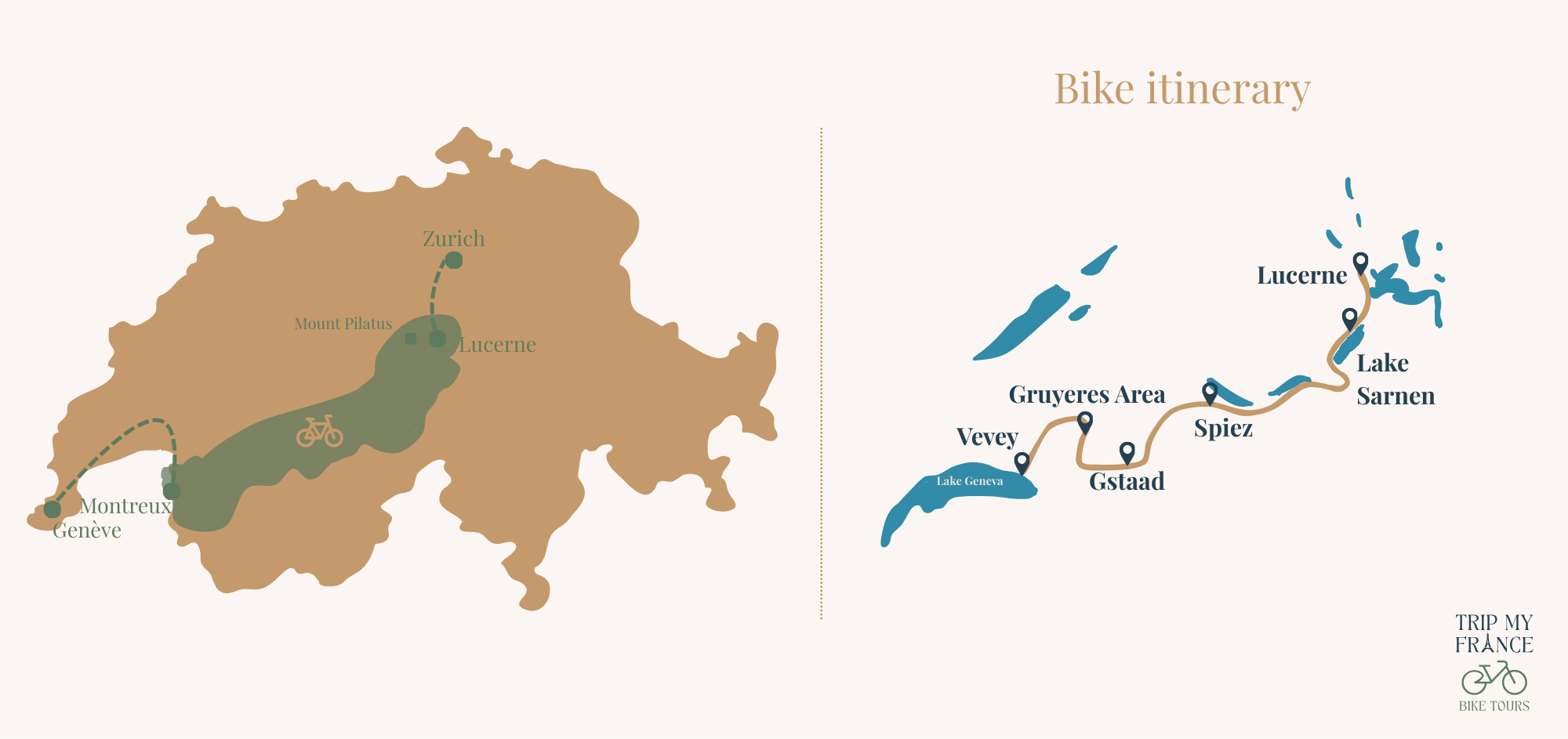 This journey through Switzerland invites you into a complete immersion among shimmering lakes, terraced vineyards, and spectacular Alpine panoramas. From the international elegance of Geneva to the peaceful shores of Montreux, and through the UNESCO-listed vineyards of Lavaux, the itinerary blends cultural discovery, gourmet experiences, and cycling stages set within beautifully preserved landscapes.