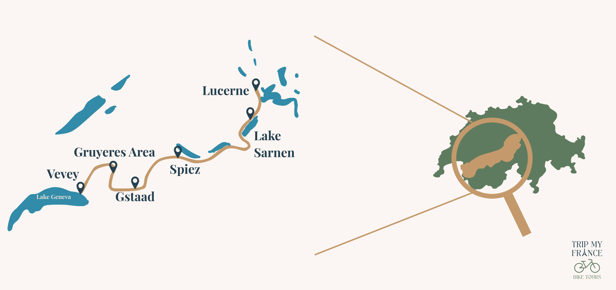 Cet itinéraire à vélo en Suisse suit les plus belles routes entre le Lac Léman et Lucerne. Vous pédalez à travers des régions emblématiques : le Lavaux, classé à l’UNESCO, la vallée du Gruyère, le Pays-d’Enhaut, les eaux turquoises du lac de Thoune, et enfin le lac des Quatre-Cantons dominé par le Mont Pilatus.