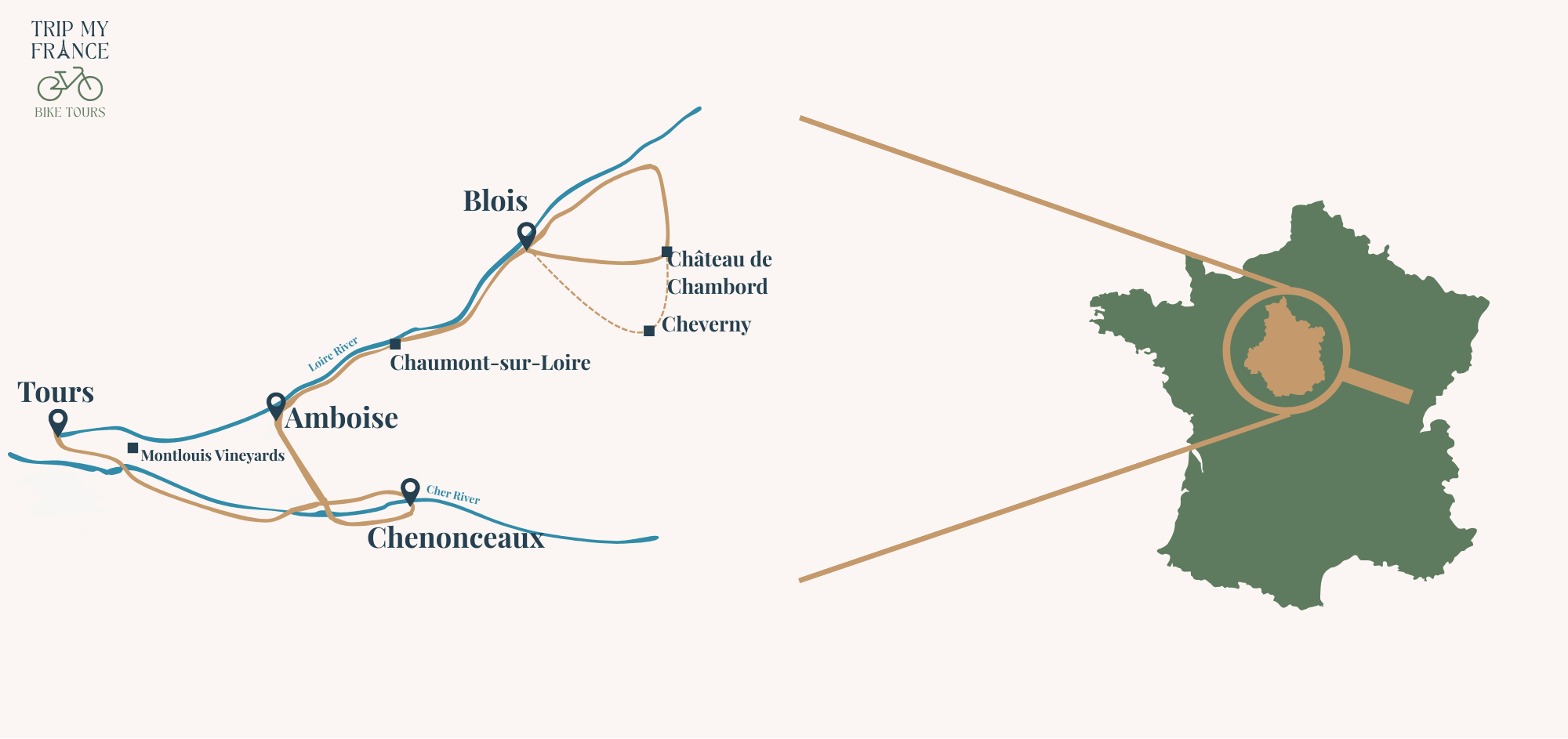 Aujourd'hui, vous pédalez à travers des villages, sur les bords de Loire et dans les vignes. L’étape du jour offre une véritable immersion dans la douceur ligérienne. En chemin, arrêtez-vous au Château de Chaumont-sur-Loire, perché sur un promontoire dominant le fleuve. Ce château fut racheté par Catherine de Médicis, qui en fit un lieu d’art et de diplomatie avant de le céder à sa rivale Diane de Poitiers. Aujourd’hui, il abrite le Festival International des Jardins, un événement de renommée mondiale mêlant art contemporain et création paysagère.
